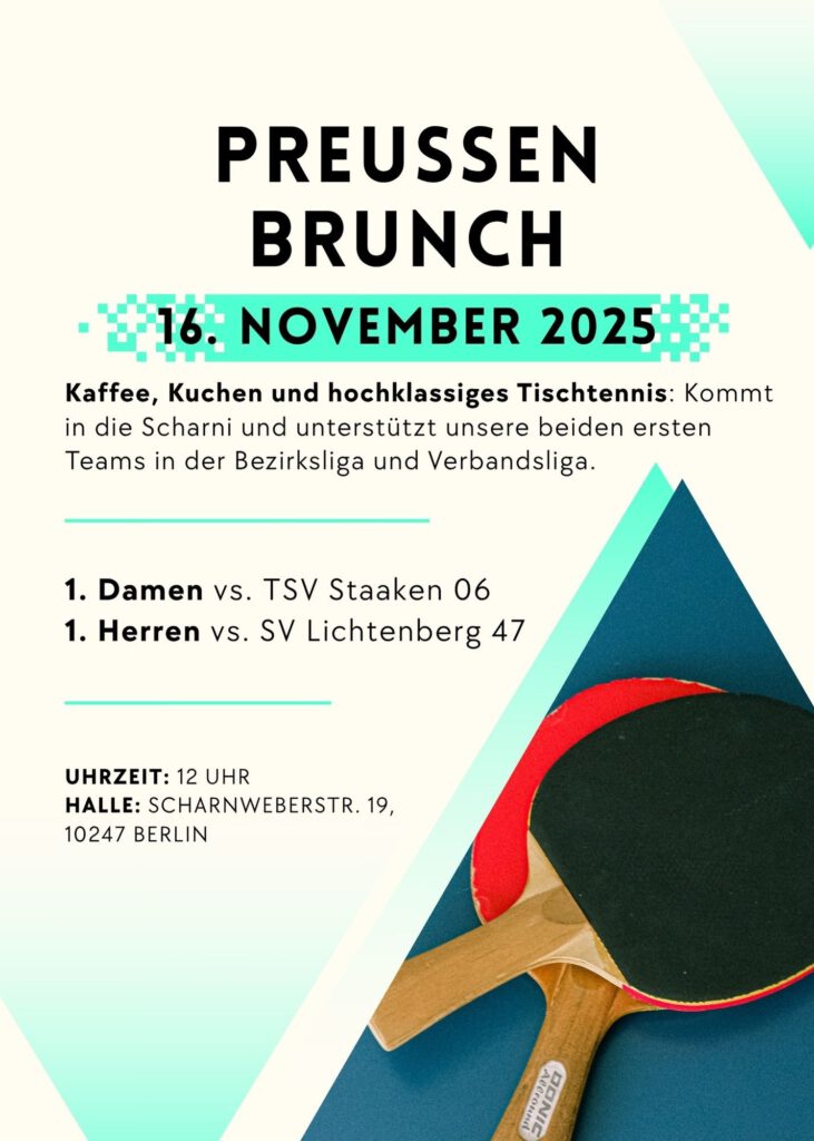 Am Doppelspieltag der beiden ersten Teams veranstaltet der Verein zum ersten Mal einen Preußen-Brunch für alle Mitglieder und interessierte Zuschauerinnen und Zuschauer.
